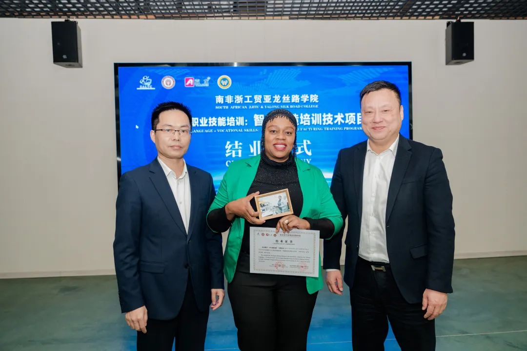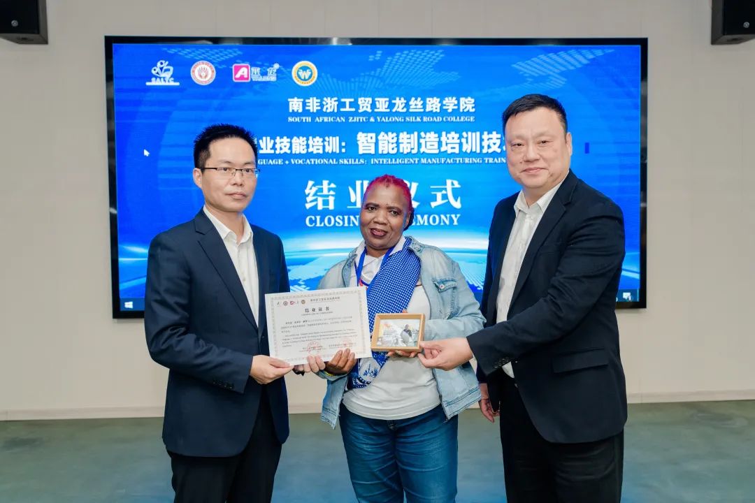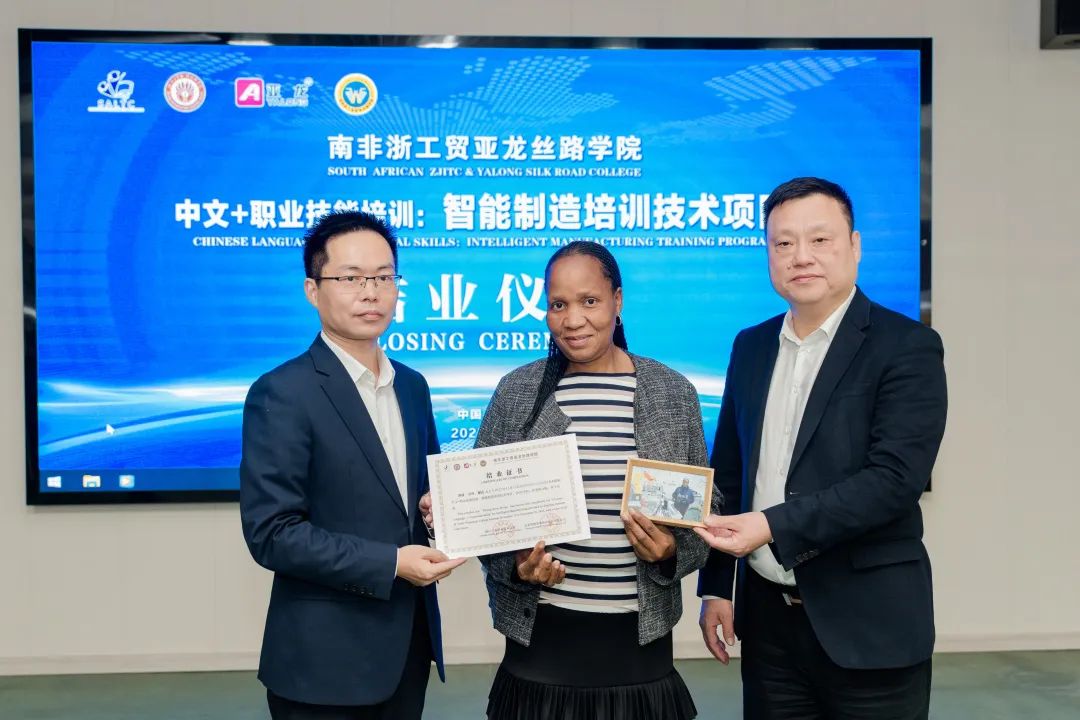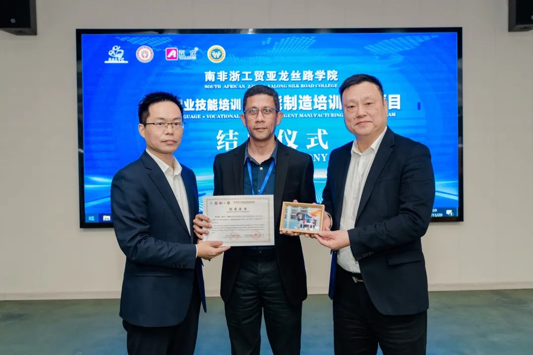 11月20日下午,南非浙工贸亚龙丝路学院首届“中文+职业技能”培训项目结业仪式顺利举行。南非高等教育与培训部讲师发展中心与支持处主任莫妮卡·沃尔特(Monica Van der Walt),亚龙智能装备集团股份有限公司总经理陈传周和学校校长余闯、副校长王春柳等出席结业仪式。