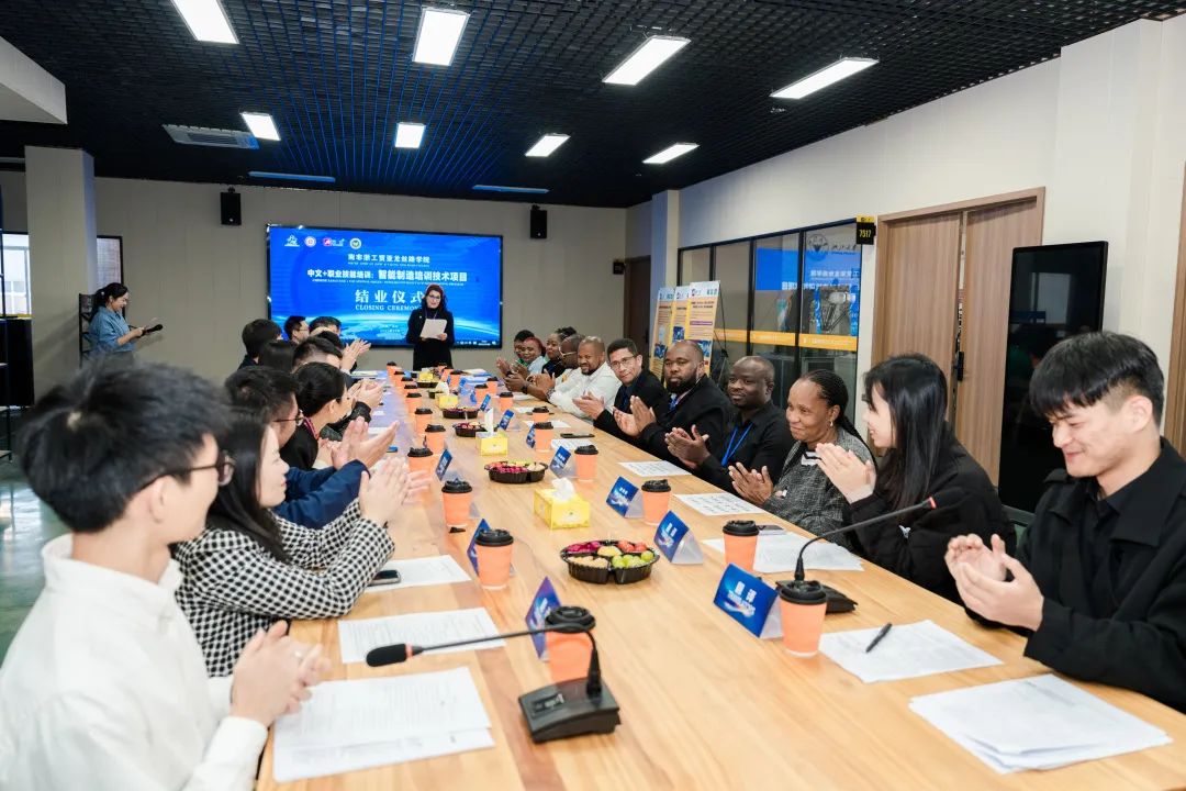 余闯向顺利完成全部培训课程的南非教师朋友们表示祝贺。他指出,通过一周的学习和实践,南非教师代表团学习智能制造技术培训,考察“千年东瓯国,诗画白鹿城”,体验温州非遗传统文化,与工贸学院结下深厚友谊。他表示,未来工贸学院将致力于中南教育人文交流,做深做实南非浙工贸亚龙丝路学院;加快建设南非社区学院教师培训基地,探索中南社区教育教师培养新路径;积极响应《中非人才培养合作计划》号召,使“中文+职业技能”培训项目规模化、常态化。他希望,在中南关系的“黄金年代”,在亲如兄弟的中南情谊下,工贸学院能持续加强与南非高教部与南非中国文化和国际交流中心的合作,携手为构建新时代中非职业教育共同体作出新的更大贡献。