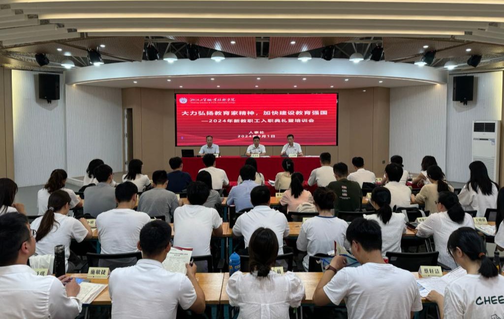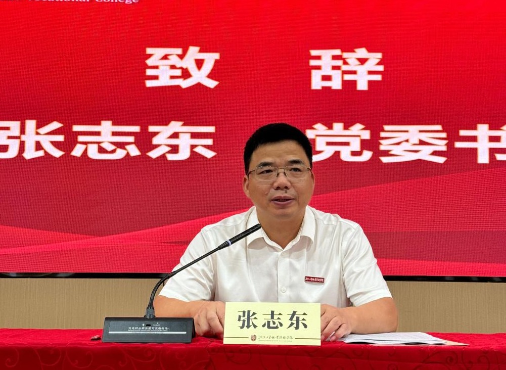 新教师入职典礼上,首先,张志东对新入职教师表示热烈欢迎,他指出,工贸学院坐落在中国民营经济重要发祥地温州,有64年职业教育办学历史,艰苦创业、拼搏奋进是工贸学院融入骨髓的文化内涵。工贸学院始终秉持“以生为本,德育为先”的办学宗旨、“厚德明理、尊师重教”的治校理念,为创建“创新性、开放式、服务型职业技术大学”的奋斗目标不懈努力。他强调“三寸粉笔,三尺讲台系国运;一颗丹心,一生秉烛铸民魂”是我们每个教育人一生的事业和追求。希望大家将自己的奋斗与学校的发展紧密联系在一起,与学校共成长,与时代同进步,根植教育家精神,努力成为新时代“大先生”,共同书写浙江工贸学院的美好篇章。