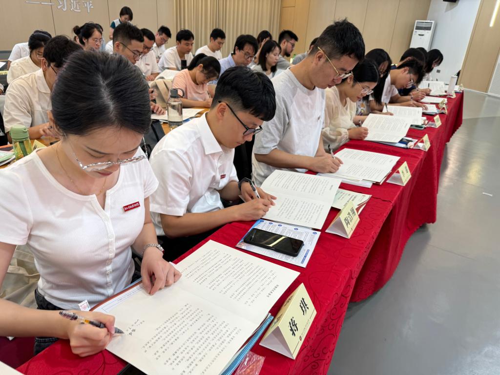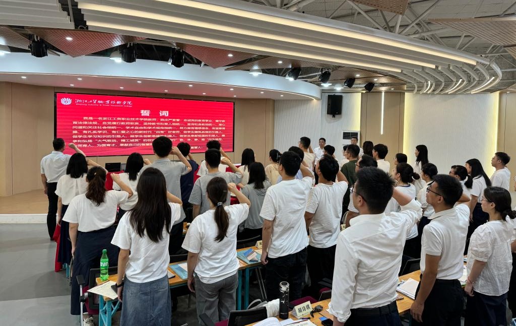 入职典礼上,新教师佩戴校徽,签署《师德师风承诺书》,庄严宣誓做有理想信念、有道德情操、有扎实学识、有仁爱之心的新时代“四有”好老师。