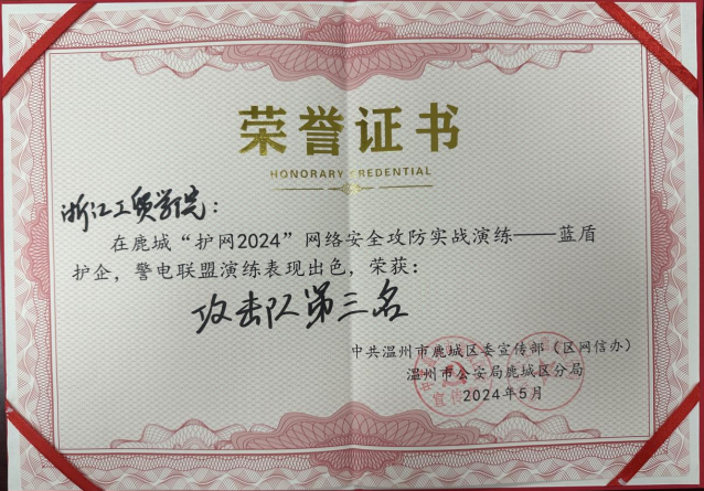 5月31日,鹿城区“护网2024”网络安全攻防实战演练-蓝盾护企,警电联盟演练落下帷幕。由技师与继续教育学院学生与图书信息中心老师联合组成的师生网络安全团队,凭借出色的技术实力和团队协作,与在温众多高校、网络安全企业同台竞技,荣获第三名的好成绩,这是对技师与继续教育学院网络安全教育和实践能力教学的充分肯定。