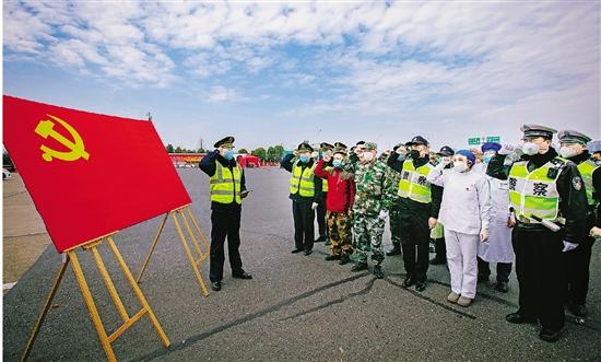 2月2日中午,杭新景高速杭州南防疫检查点临时党支部成立,党员们重温入党誓词。浙江新闻客户端记者 董旭明 拍友 顾肖艳 方悦 摄