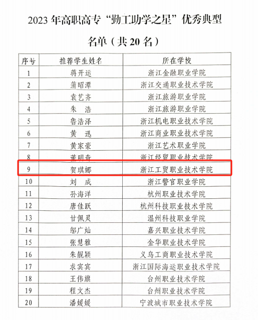 12月4日,浙江省教育发展中心发布了《关于公布2023年“校园励志之星”“勤工助学之星”“三助岗位之星”名单的通知》,现代管理学院知识产权管理2002班贺琪娜同学获评浙江省2023年“勤工助学之星”优秀典型。高职高专组全省共20名学生入选。