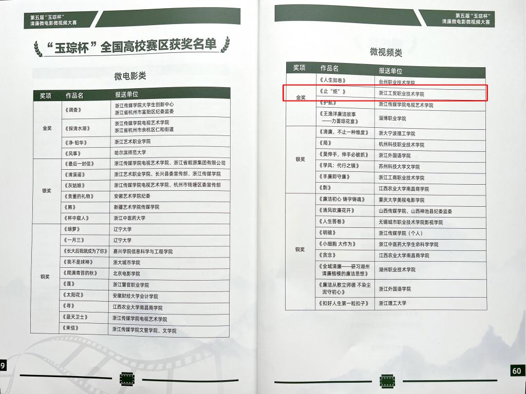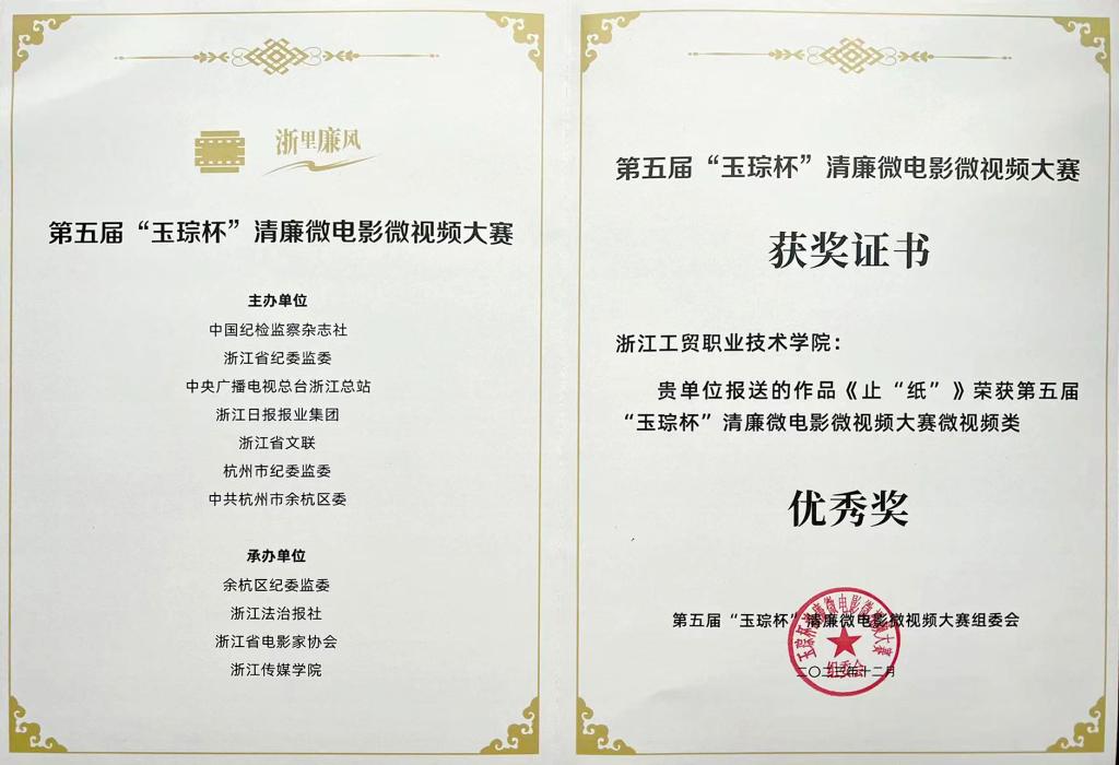 12月12日晚,第五届“玉琮杯”清廉微电影微视频大赛颁奖活动在杭州举行。由学校纪委选送的微视频作品《止“纸”》从全国1478部微视频参选作品中脱颖而出,获得“玉琮杯”优秀奖!