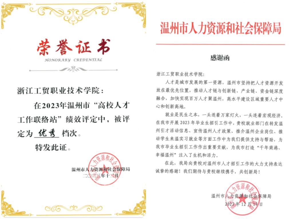 近日,温州市人力资源和社会保障局下发《关于2023年度市本级“高校人才工作联络站”绩效评定结果的通报》, 在2023年温州市高校人才工作联络站评选中再次获评优秀等次,这也是自2021年温州市开展“高校人才工作联络站”评选以来我校获特别优秀等次一次,优秀等次二次。