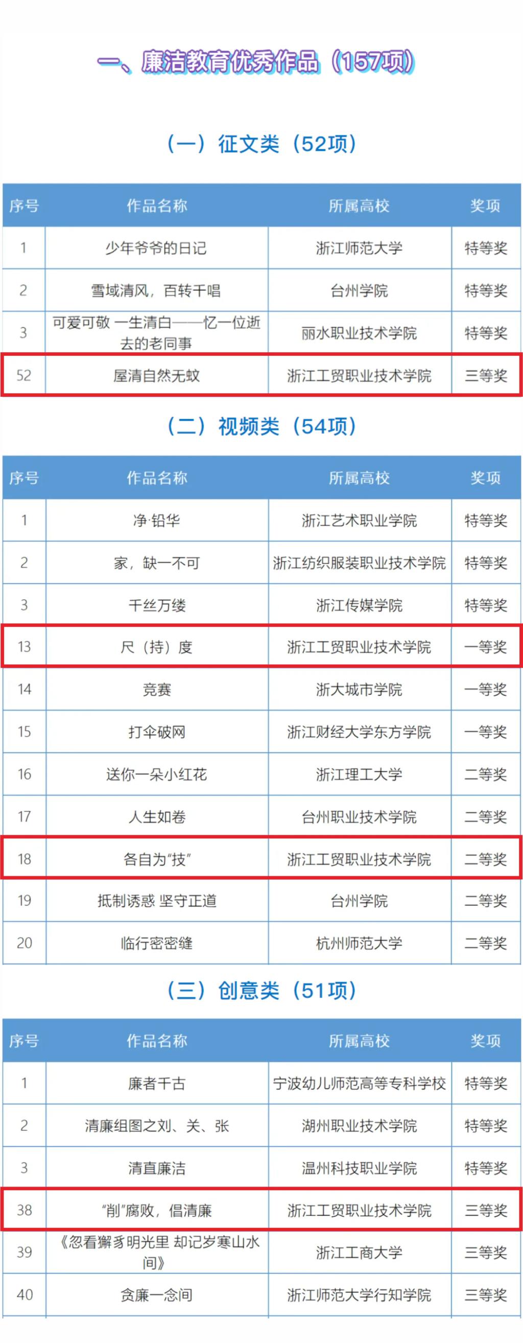 视频类作品中,学校纪委组织拍摄的清廉微电影《尺(持)度》获一等奖,设计与数字艺术学院制作主题动画《各自为“技”》获二等奖。